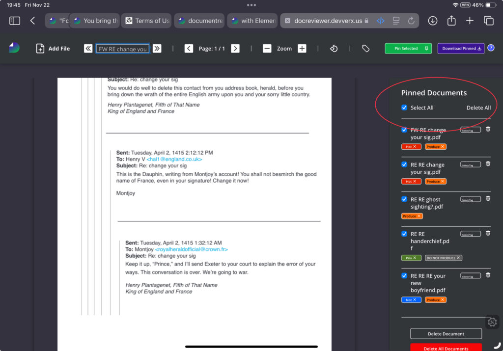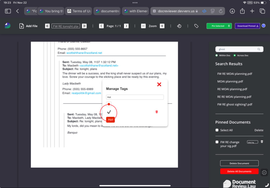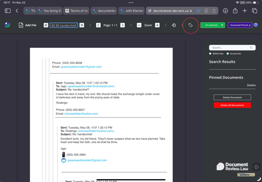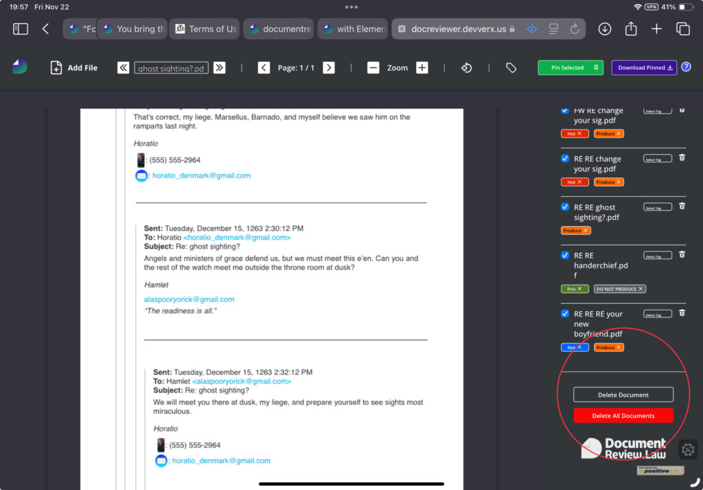 Delete pins and tags individually by clicking the delete icon, or en masse by using the check boxes or clicking “select all.” Deleting pins or tags does not delete the document from the reviewer. To delete one document from the reviewer, click the delete document button and confirm your choice. Delete all documents from the reviewer by clicking the red delete all button and confirming your choice. Documents are never deleted from your computer or cloud service.