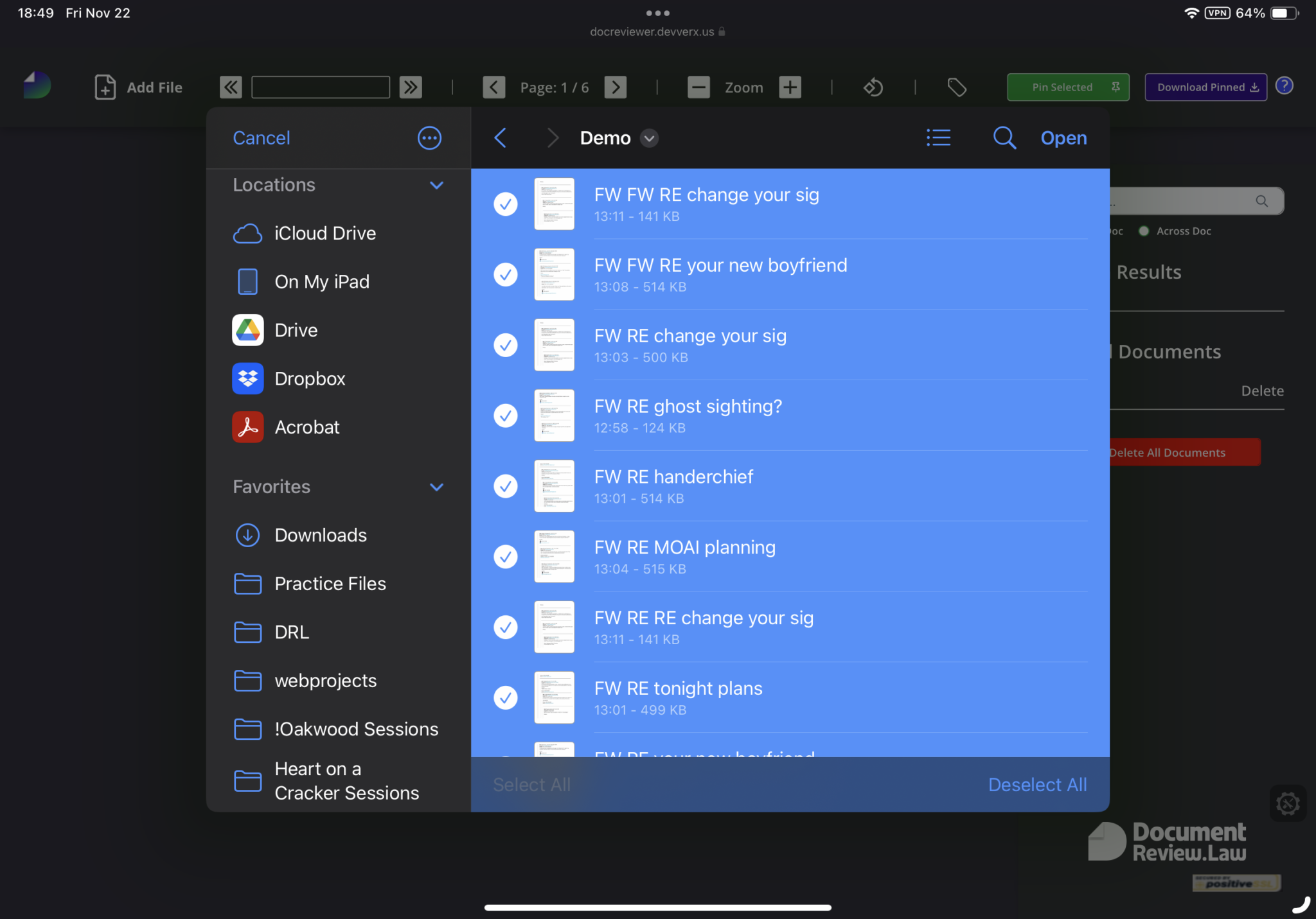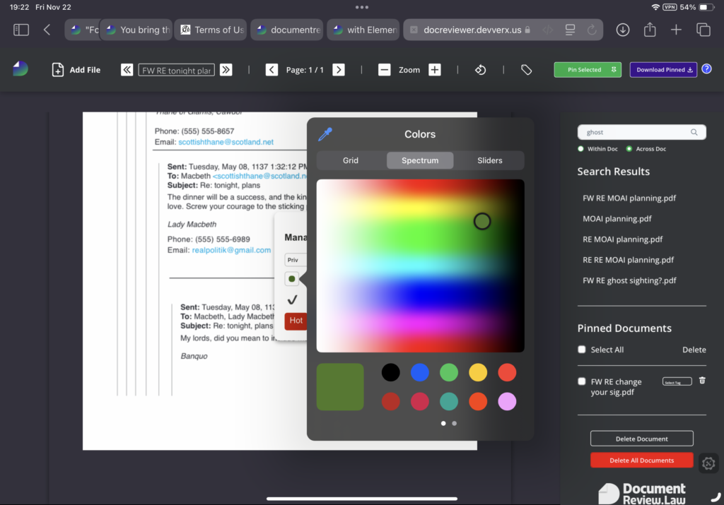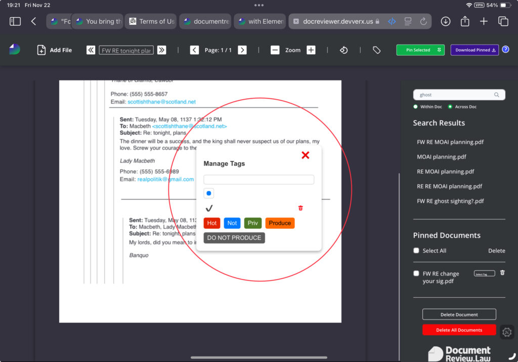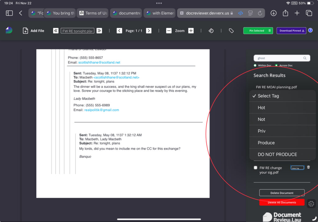 Delete pins and tags individually by clicking the delete icon, or en masse by using the check boxes or clicking “select all.” Deleting pins or tags does not delete the document from the reviewer. To delete one document from the reviewer, click the delete document button and confirm your choice. Delete all documents from the reviewer by clicking the red delete all button and confirming your choice. Documents are never deleted from your computer or cloud service.