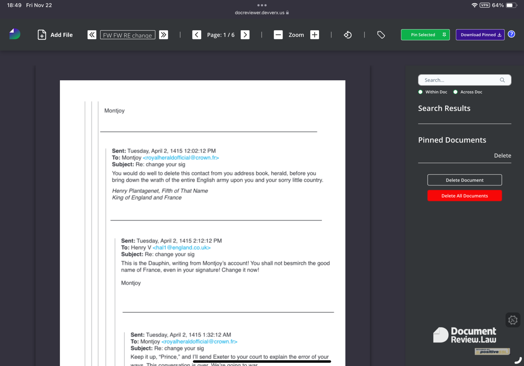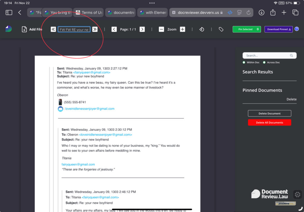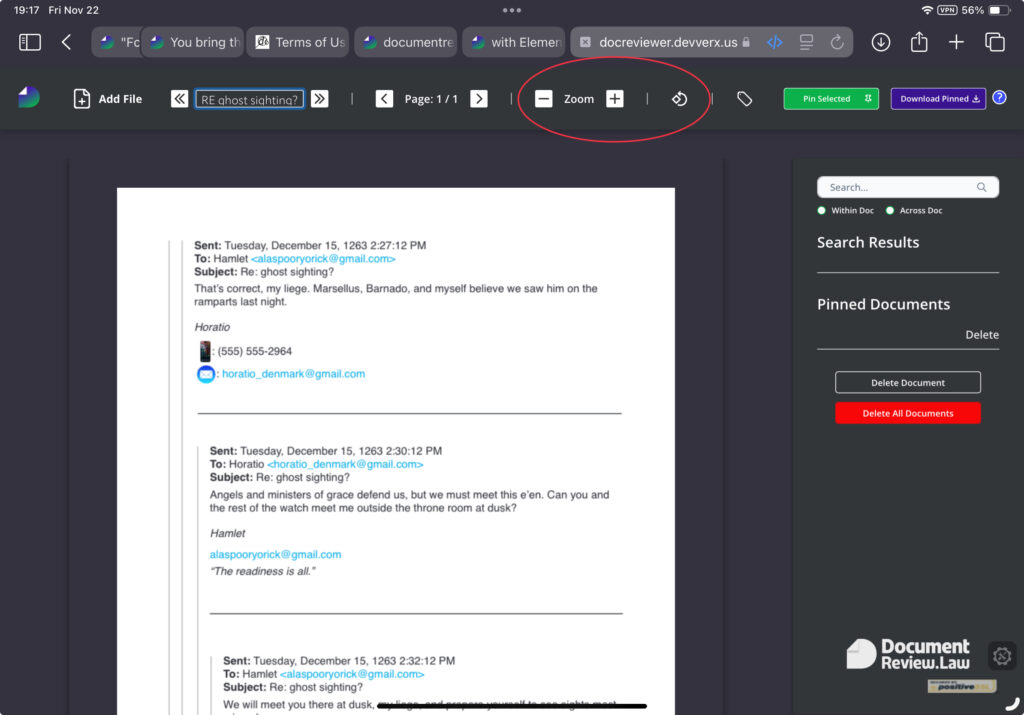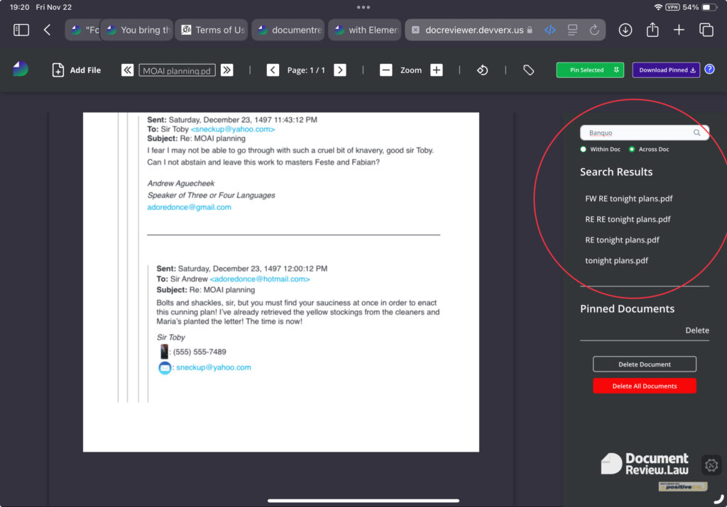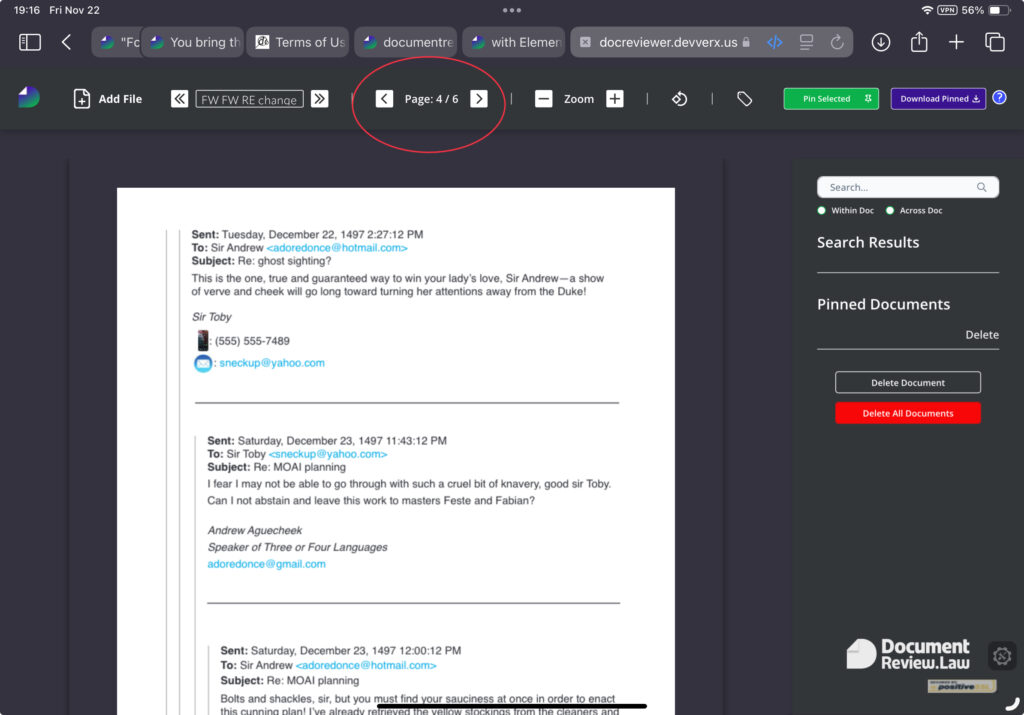 Enter a discrete term in the search box and then search within a document by clicking the “within doc” button. Search across all documents loaded into the reviewer by clicking “across doc” button. (Boolean searching is not currently supported.) Click on a search result to load that page or document.