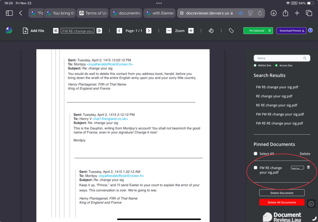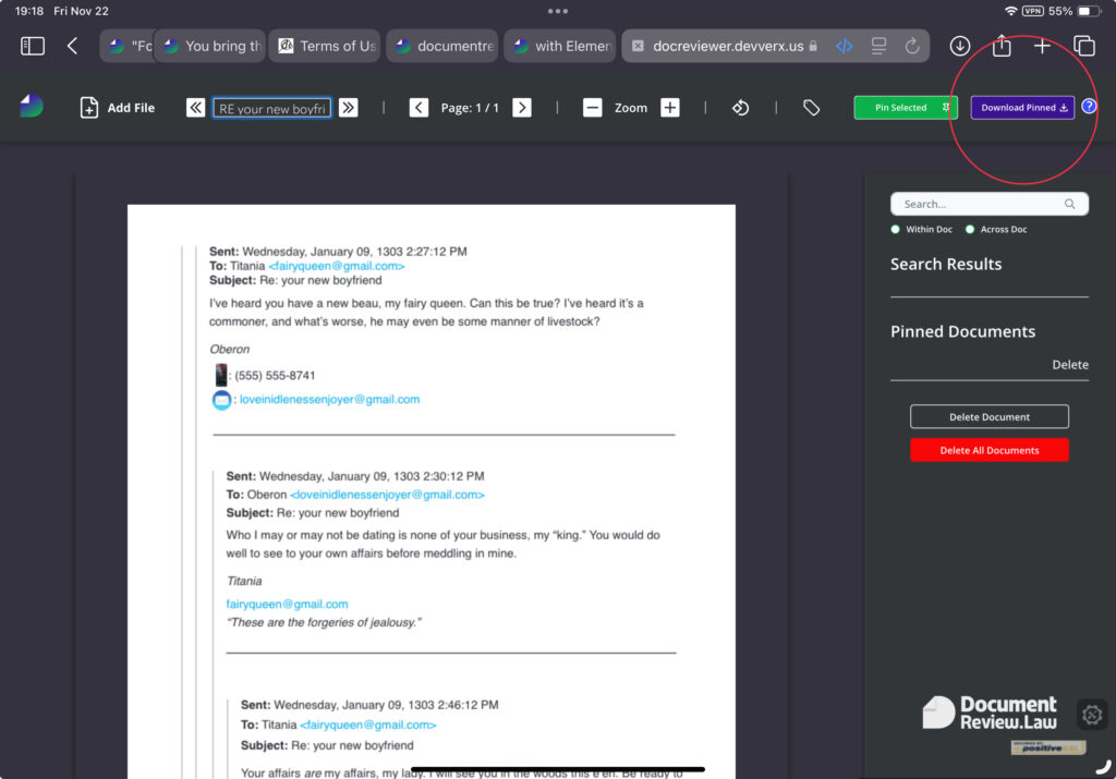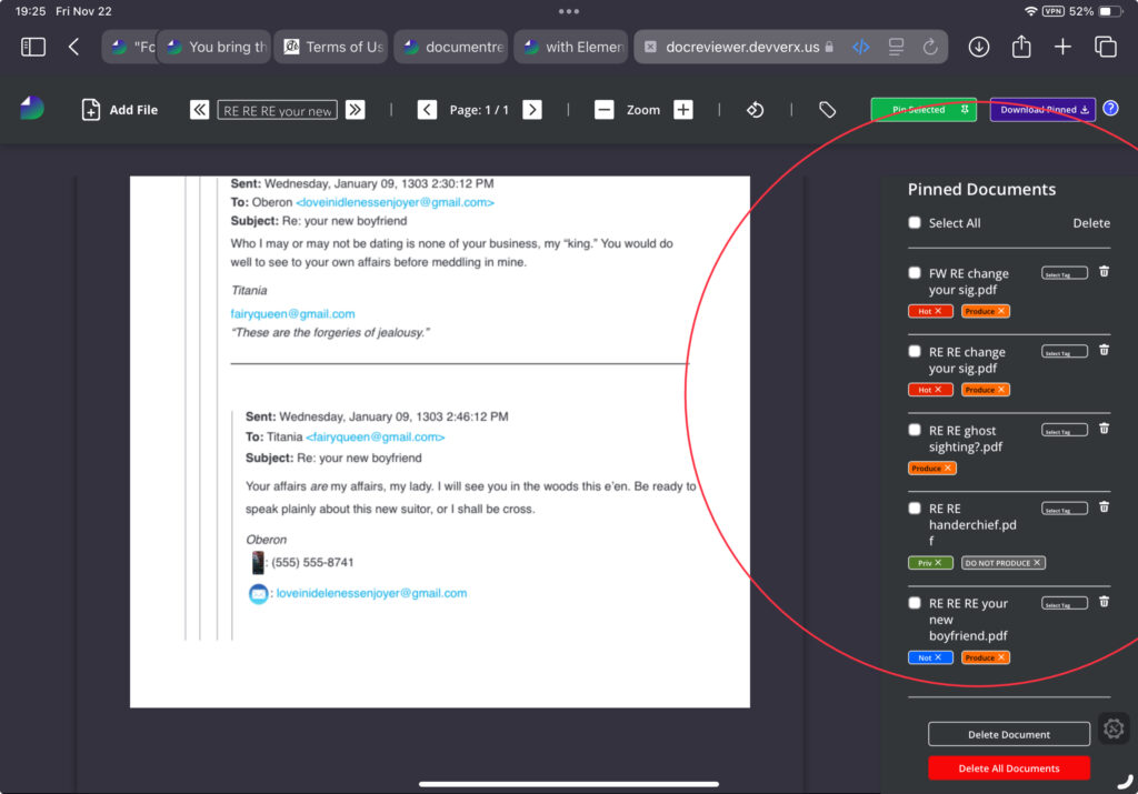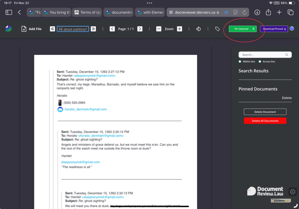 Pin hot docs to keep track of them. (See Tag Pinned Documents, infra, for adding tags to pinned documents.) The reviewer lists pinned documents in the sidebar. Download a list of pinned documents along with your tagging by clicking the purple download pinned button on the righthand side of the toolbar. Your browser will generate a .csv file which you can easily open in Excel, allowing you to sort and analyze your document review work product.